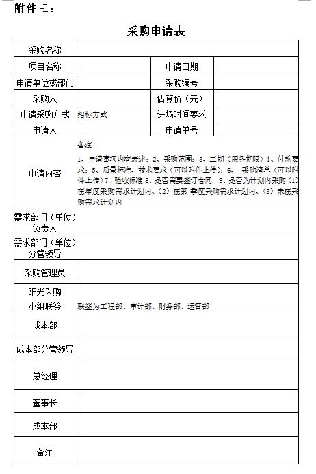 3.工作流程:需求部門(單位)提報《采購申請表》,按規(guī)定程序審批通過后,由成本部委托招標代理機構具體實施。