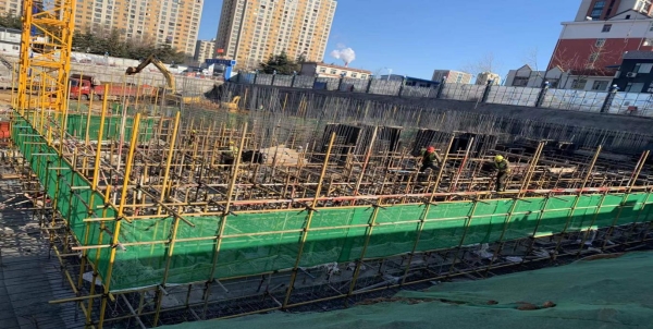4#樓筏板基礎施工完成,正在綁扎地下2層剪力墻鋼筋及模板支護工作;